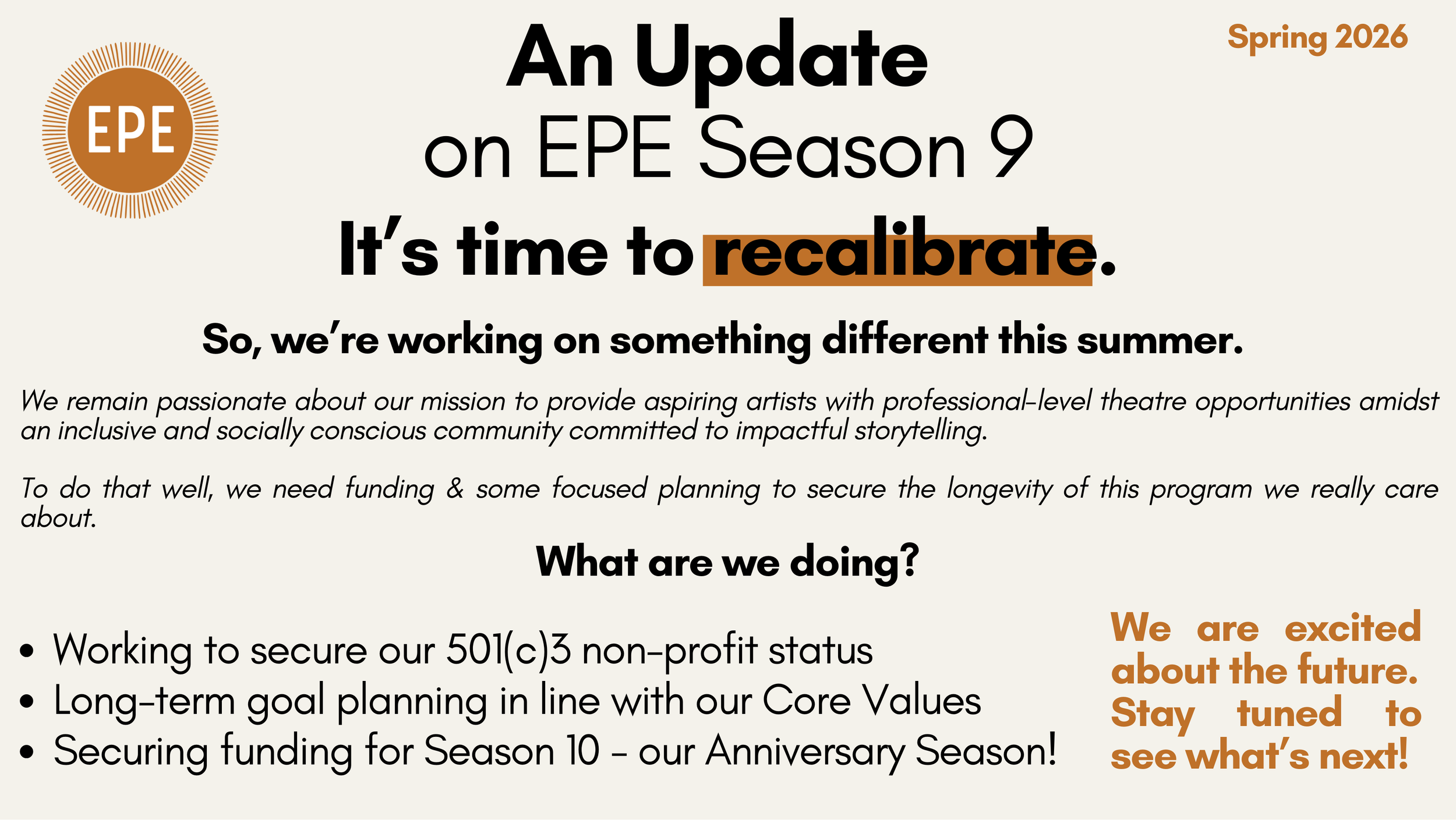 The Emerging Professionals Ensemble provides aspiring artists with professional-level theatre opportunities amidst an inclusive and socially conscious community committed to impactful storytelling.